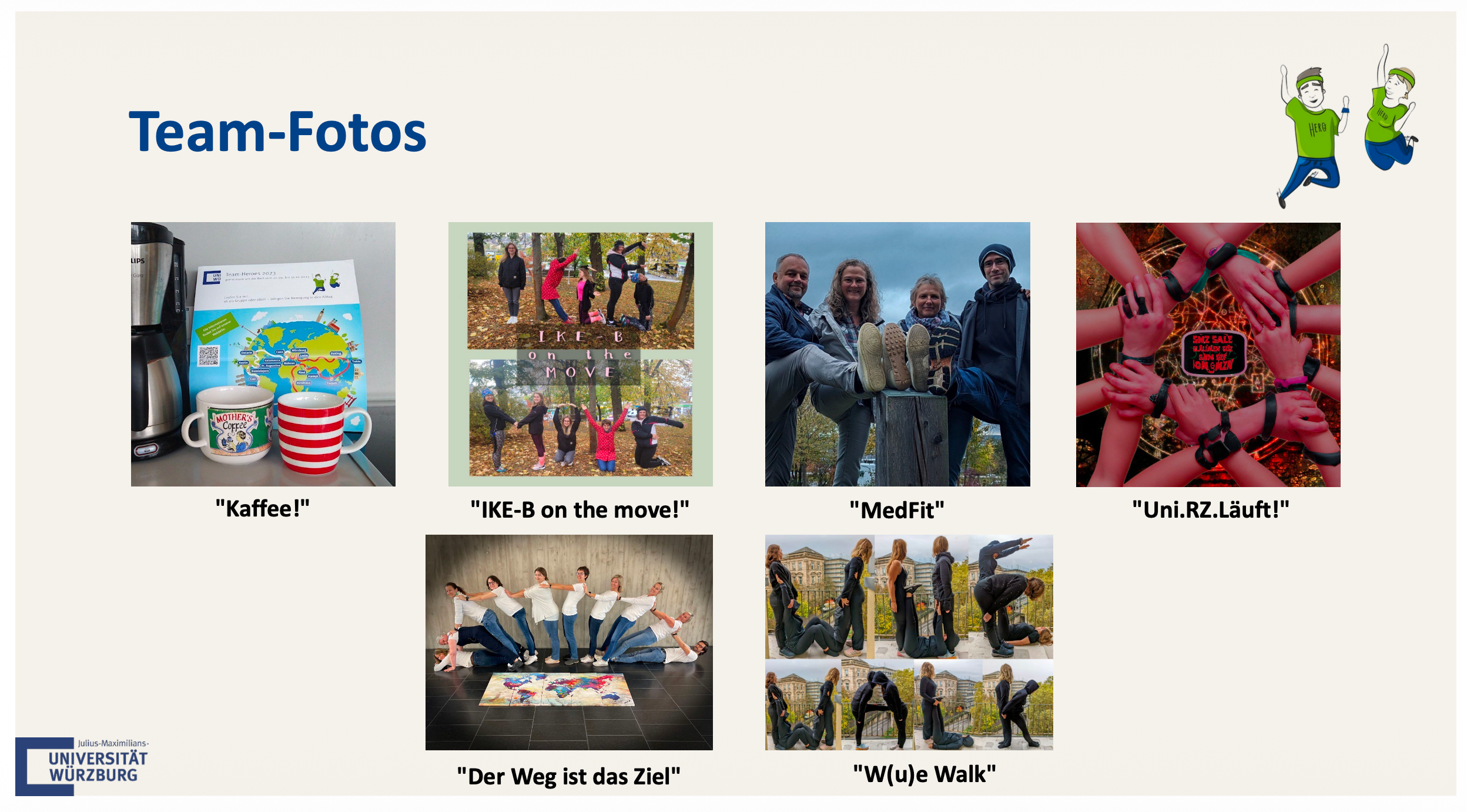 Mit insgesamt 163.806.087 gesammelten Schritten zeigten die 398 Teilnehmer in 56 Teams der Uni Würzburg, was möglich ist, wenn Gemeinschaft und Wettbewerb zusammenkommen. Ein Team stach besonders hervor: "Gigantische Gang: Uni.RZ.Läuft!" erreichte den 10. Platz mit beeindruckenden 484.451 kumulierten Schritten. Dies verdeutlicht die Kraft kollektiver Anstrengungen und individueller Bestrebungen, unterstützt durch inspirierende Teamfotos, die den Gemeinschaftsgeist einfangen.