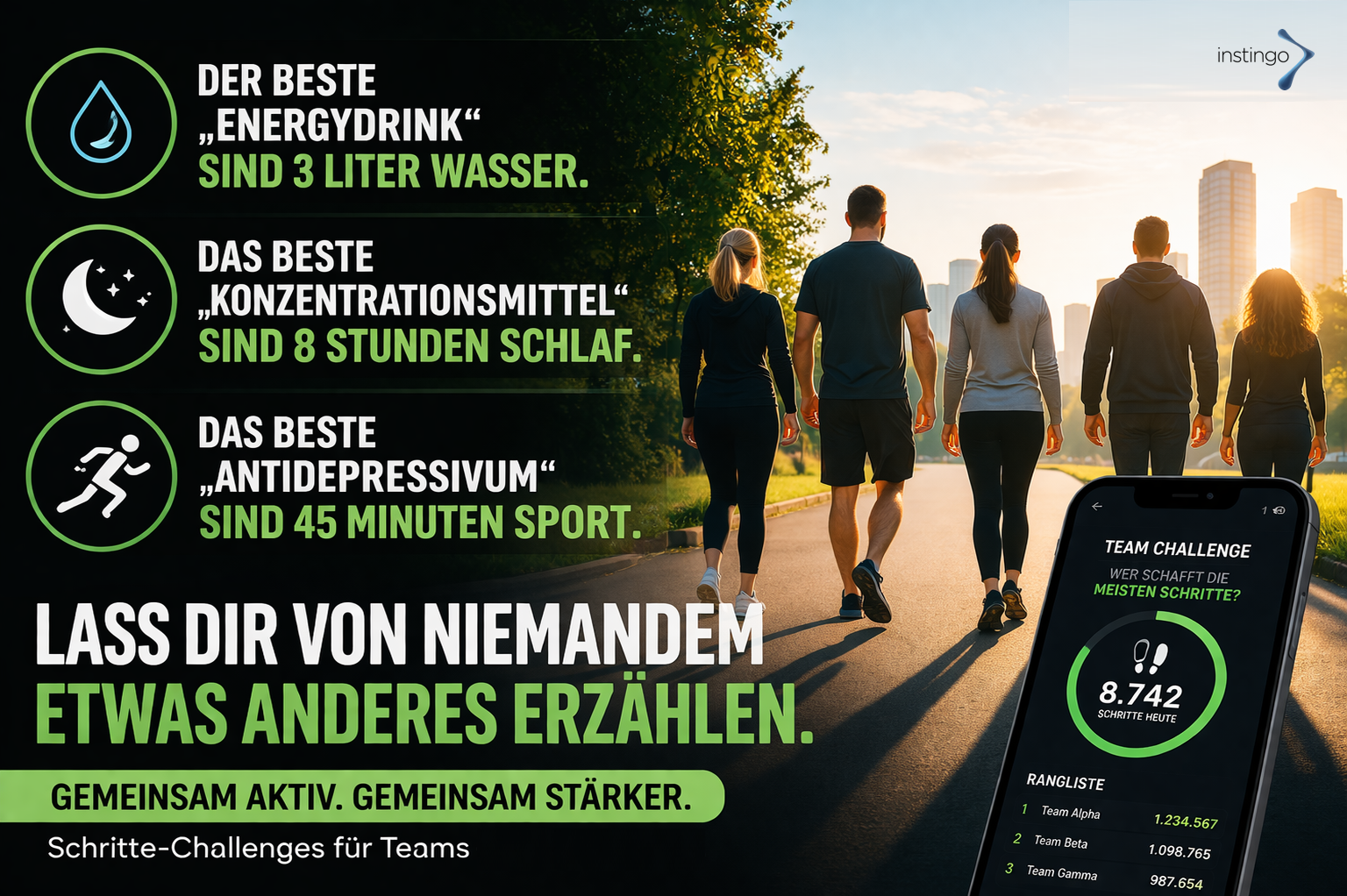 Mit instingo wird Bewegung Teil der Unternehmenskultur. Mitarbeitende sammeln Schritte, vergleichen sich in Teams und bleiben durch spielerische Elemente langfristig motiviert.